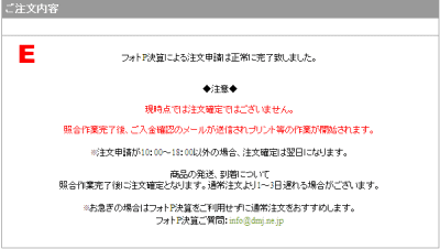 | 上記の画面が表示されればフォトP決済による注文は完了です。 照合作業完了後、【ご入金確認のメール】が送信されプリント等の作業が開始されます。 |